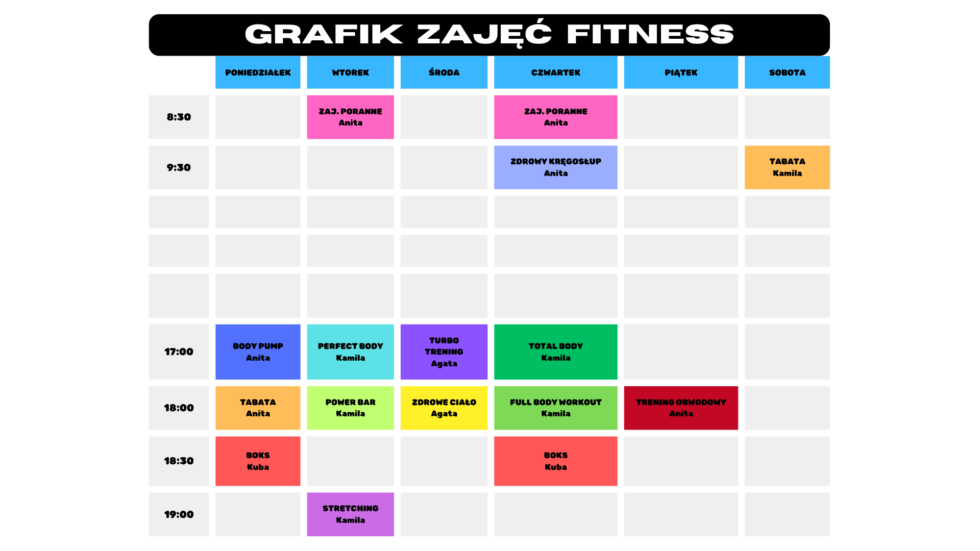 Zajęcia fitness w naszym klubie są zajęciami dodatkowymi, dlatego harmonogram oraz obecność instruktorów mogą ulec zmianie.